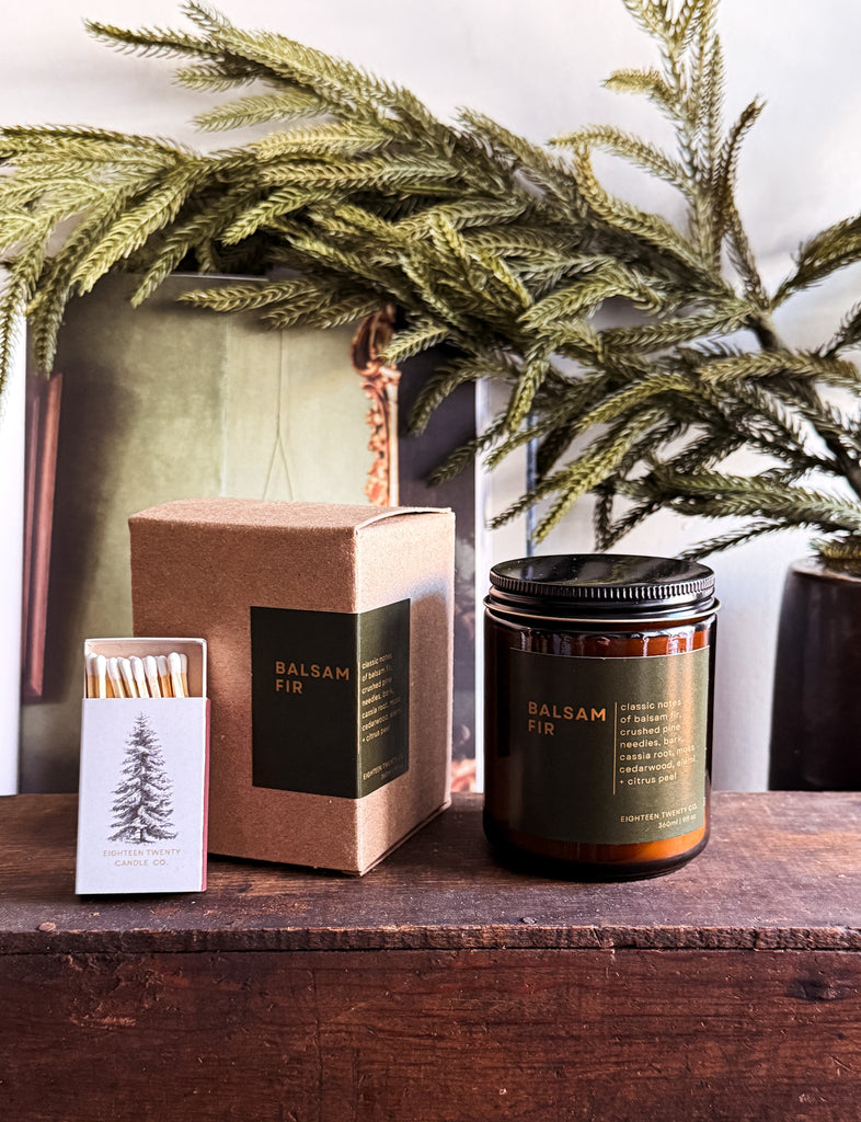 Our best selling Balsam Fir fragrant holiday candle in amber glass with matching mini boxed tree matches! Keep for yourself or gift to someone special!